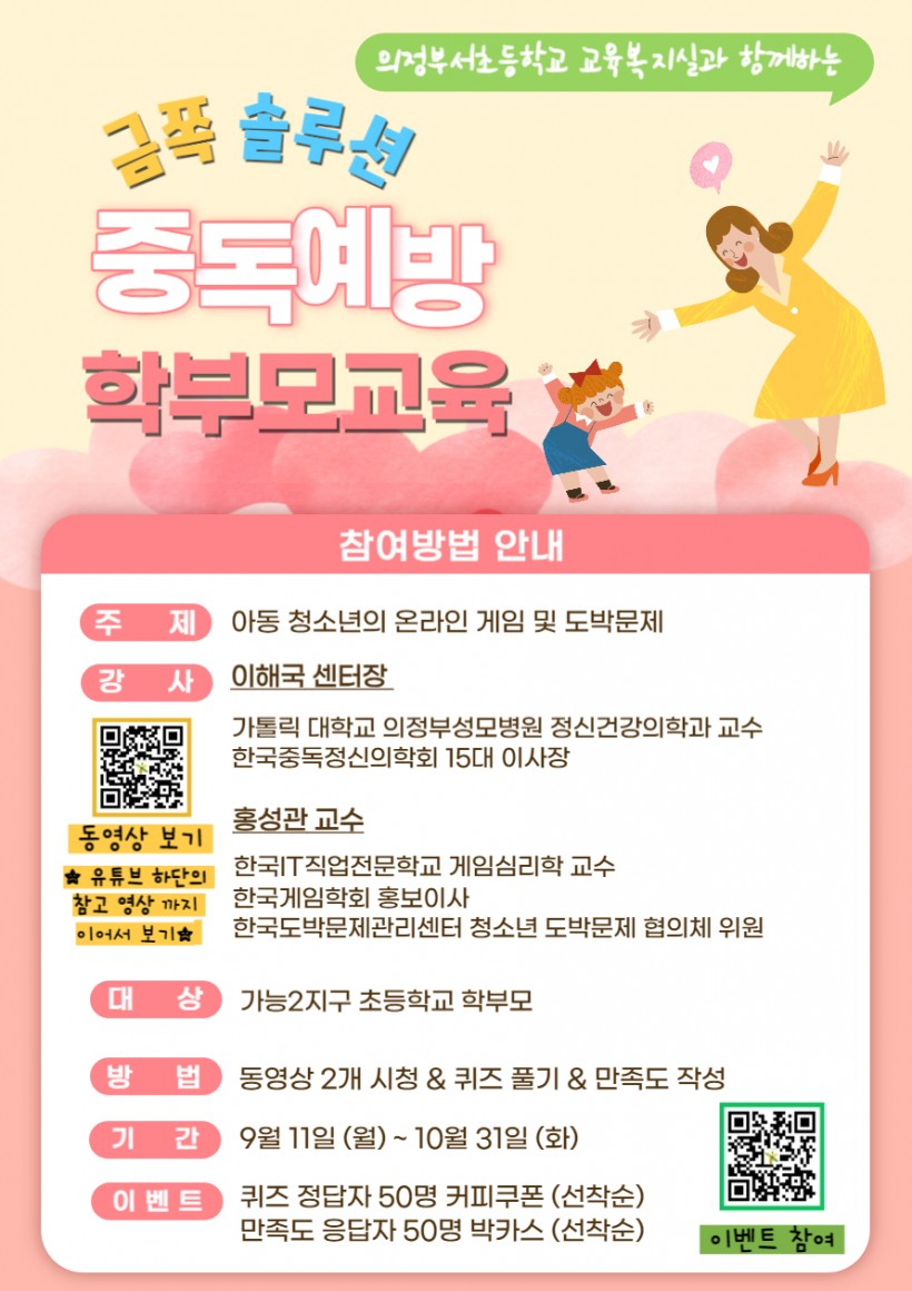 2023년 학부모교육 '금쪽솔루션 실시' 페이지 정보 작성자 관리자 작성일23-09-15 11:44 조회199회 댓글0건 이전글 다음글 목록 본문 의정부시중독관리통합지원센터에서는 가능2지구 초등학교 학부모를 대상으로아동청소년 중독 예방교육을 실시하고 있습니다 ^^관심있는 분들의 많은 참여 부탁드립니다. ★ 동영상 보기 → 클릭 Click ☆ 이벤트 참여 및 만족도 조사 → 클릭 Click 이전글 다음글 목록