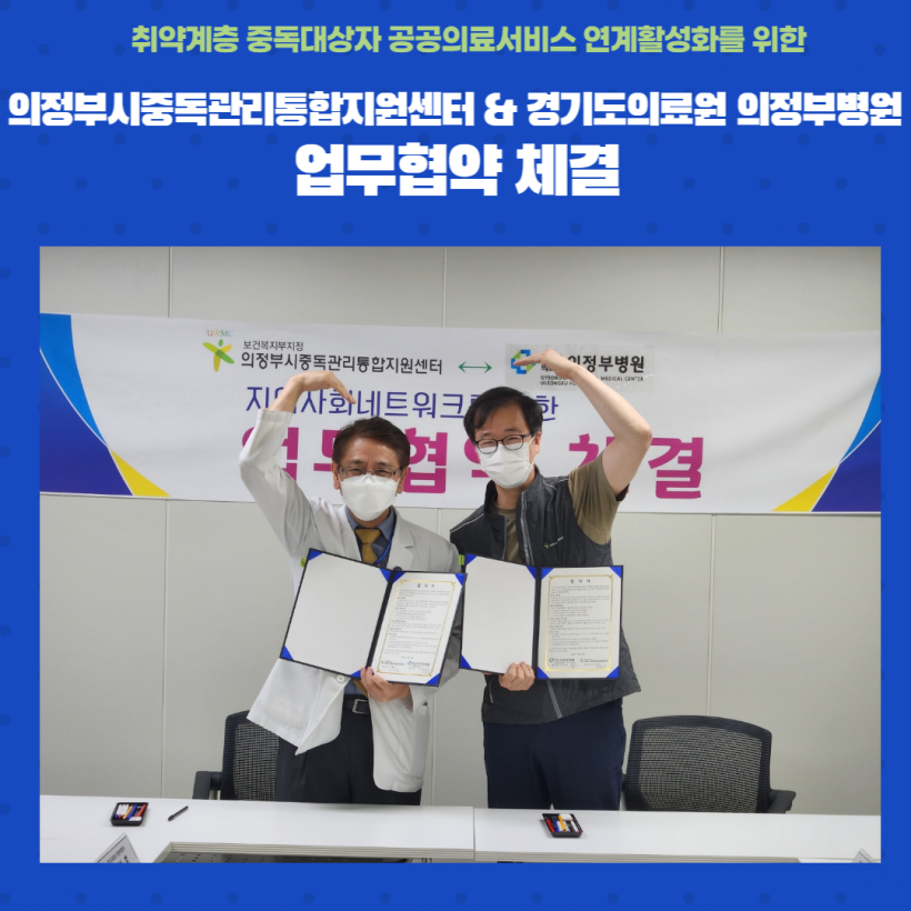 의정부시중독관리통합지원센터, 경기도의료원 업무협약체결 페이지 정보 작성자 관리자 작성일23-05-31 18:27 조회191회 댓글0건 이전글 다음글 목록 본문 2023년 5월 31일 의정부시중독관리통합지원센터와 경기도의료원 의정부병원은 "취약계층 중독대상자 공공의료서비스 연계활성화를 위한 업무협약을 체결하였다. 이전글 다음글 목록
